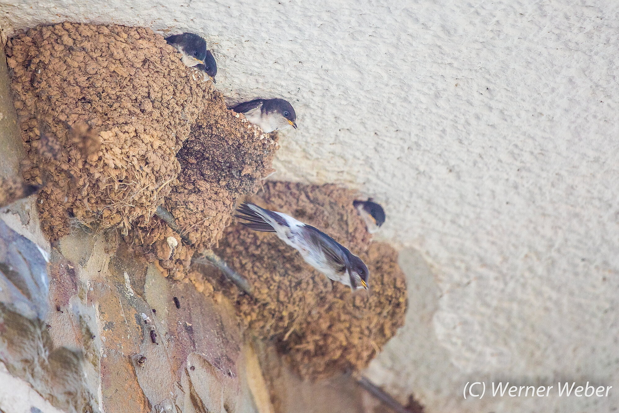 Die Mehlschwalbe baut ihre kunstvollen Lehmnester außen an die Fassade von Gebäuden, wie hier in Neunkirchen. Als Insektenjäger sorgt sie dafür, dass insbesondere Blattläuse und Mücken in Schach gehalten werden. Mehr über die Mehlschwalbe.
