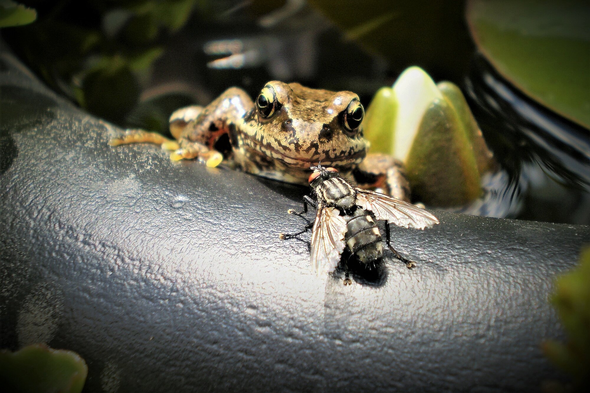 Aug in Aug! Diese Fliege scheint den Grasfrosch noch nicht entdeckt zu haben. Ein toller Schnappschuss aus einem Gartenteich in Hilchenbach.