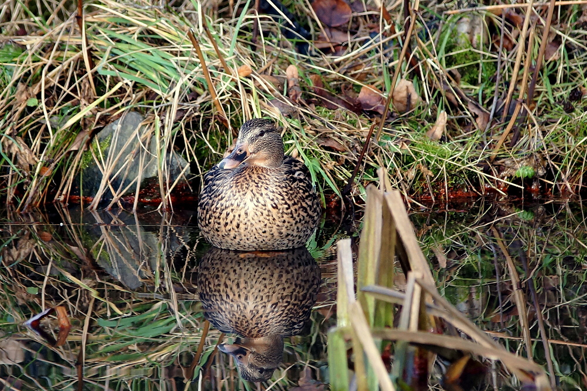 Ein Stockentenpaar nutzt den Feuersbacher Löschteich zum brüten. Das Weibchen zeigt sich im unauffälligen Tarnkleid, die detailreiche Spiegelung macht das Bild einzigartig.