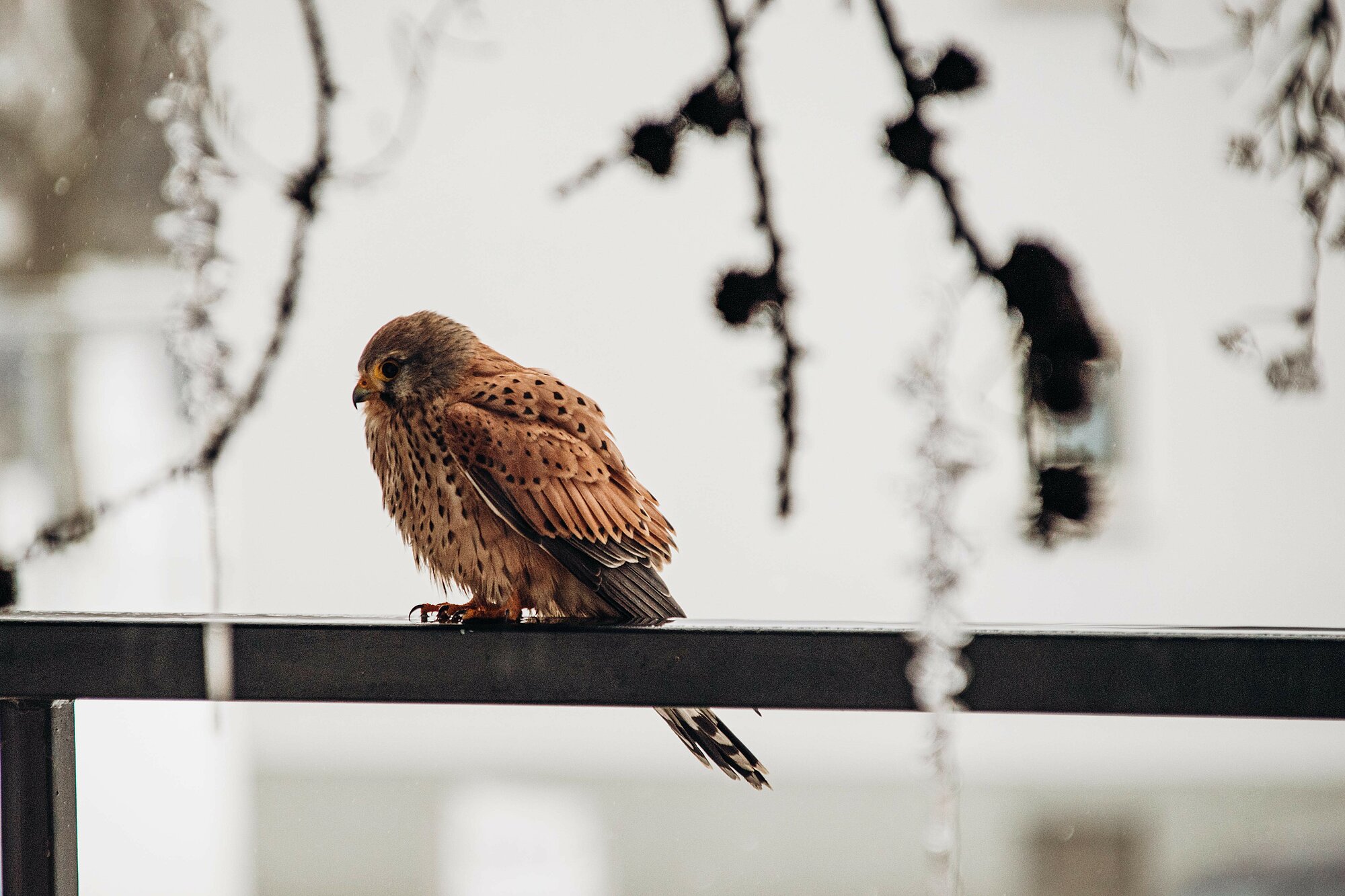 Dieser Turmfalke scheint dem nassen Wetter zu trotzen. Oftmals suchen Turmfalken den Siedlungsbereich auf, um an hohen Gebäuden zu brüten.