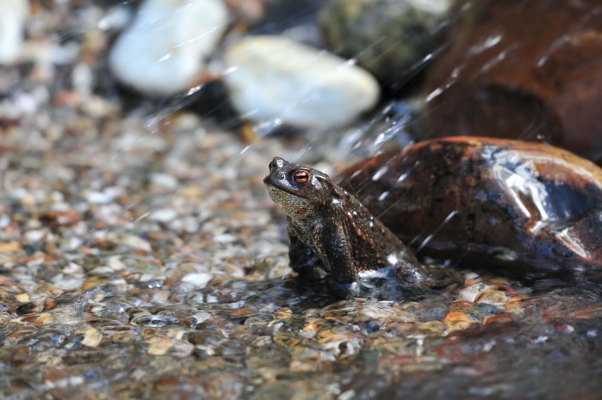 Diese Erdkröte, mit dem Namen "Quaks, der Herrnbergalm-Frosch" sitzt bei Familie Müller im Gartenteich und genießt sichtlich das von den Steinen spritzende Wasser. Ein wahrer Genießer!