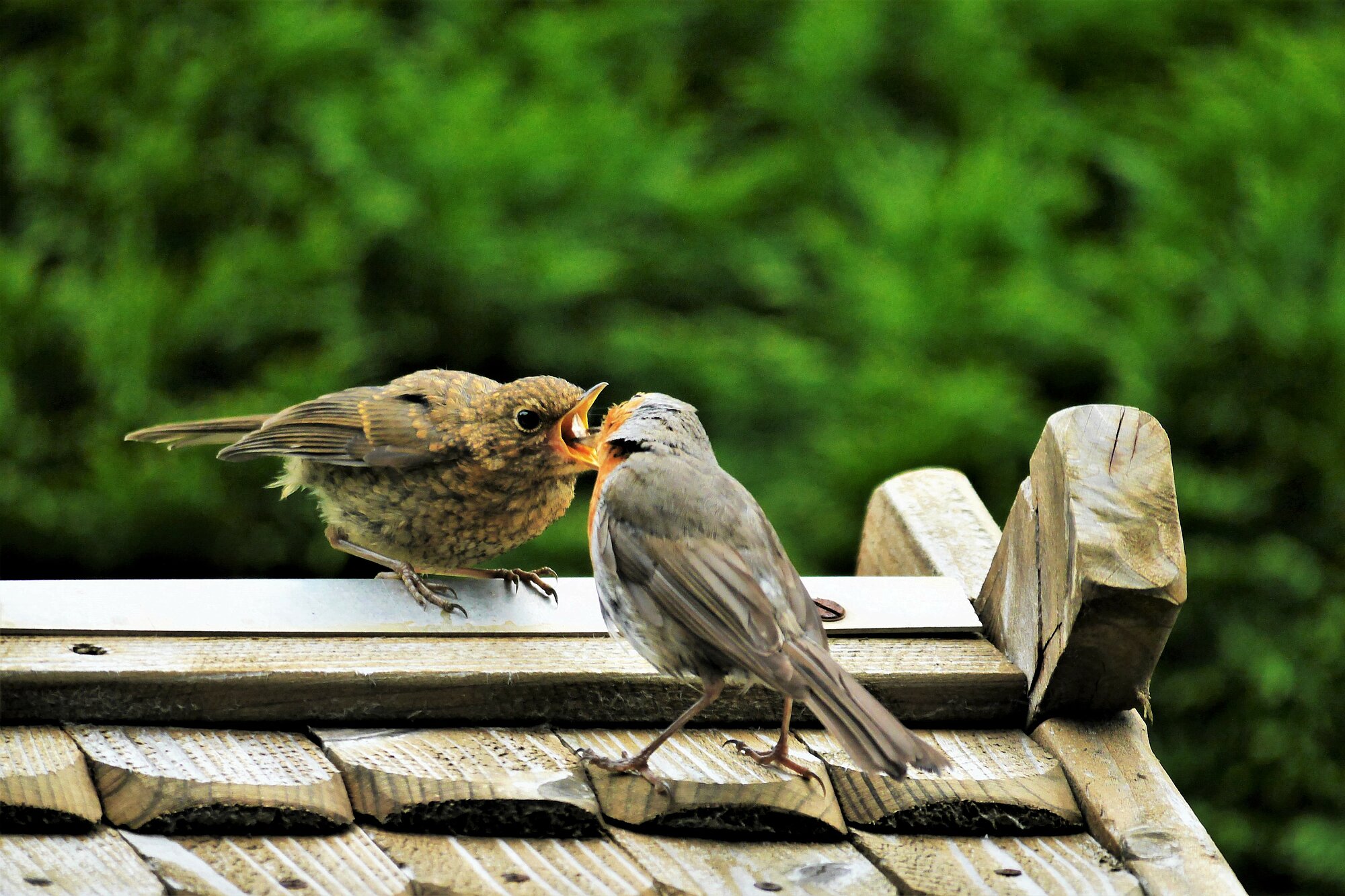Das junge Rotkehlchen ist schon flügge geworden, wird jedoch noch einige Zeit von den Eltern mit Insekten gefüttert. Eine einmalige Aufnahme aus Hilchenbach.