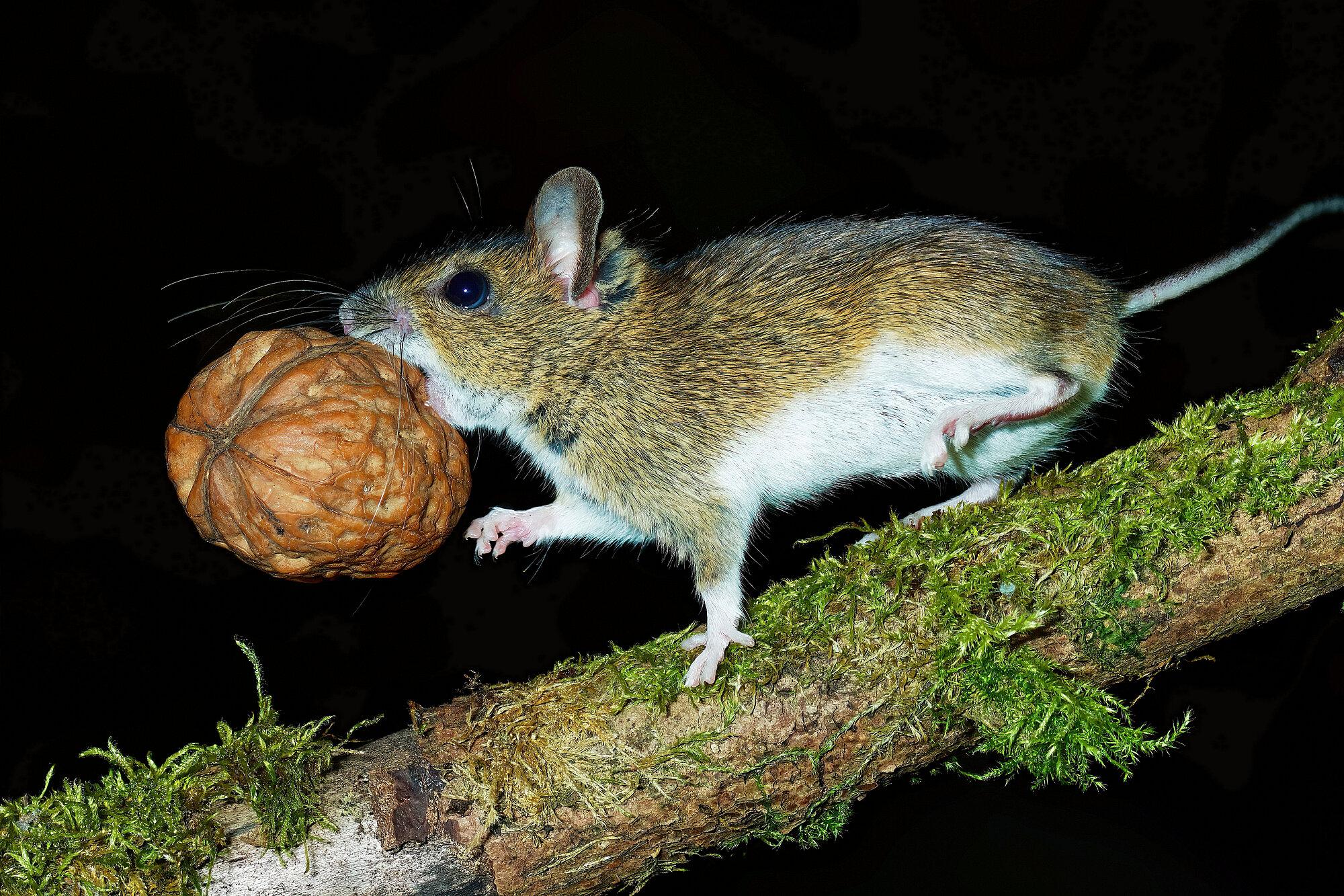 Diese Waldmaus hat einen großen Fang gemacht! Mit ihren spitzen Nagezähnen kann sie problemlos ein Loch in die dicke Schale der Nuss nagen.