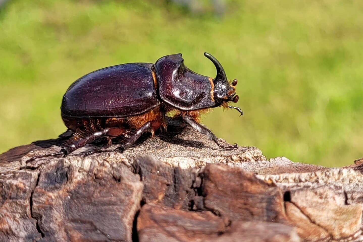 Dieser prächtige Nashornkäfer konnte in einem Garten in Hilchenbach beobachtet werden. Das Horn tragen nur die Männchen. Die bis zu 10 cm langen Larven des Nashornkäfers leben im Komposthaufen und tragen hier zum Abbau des Materials bei.