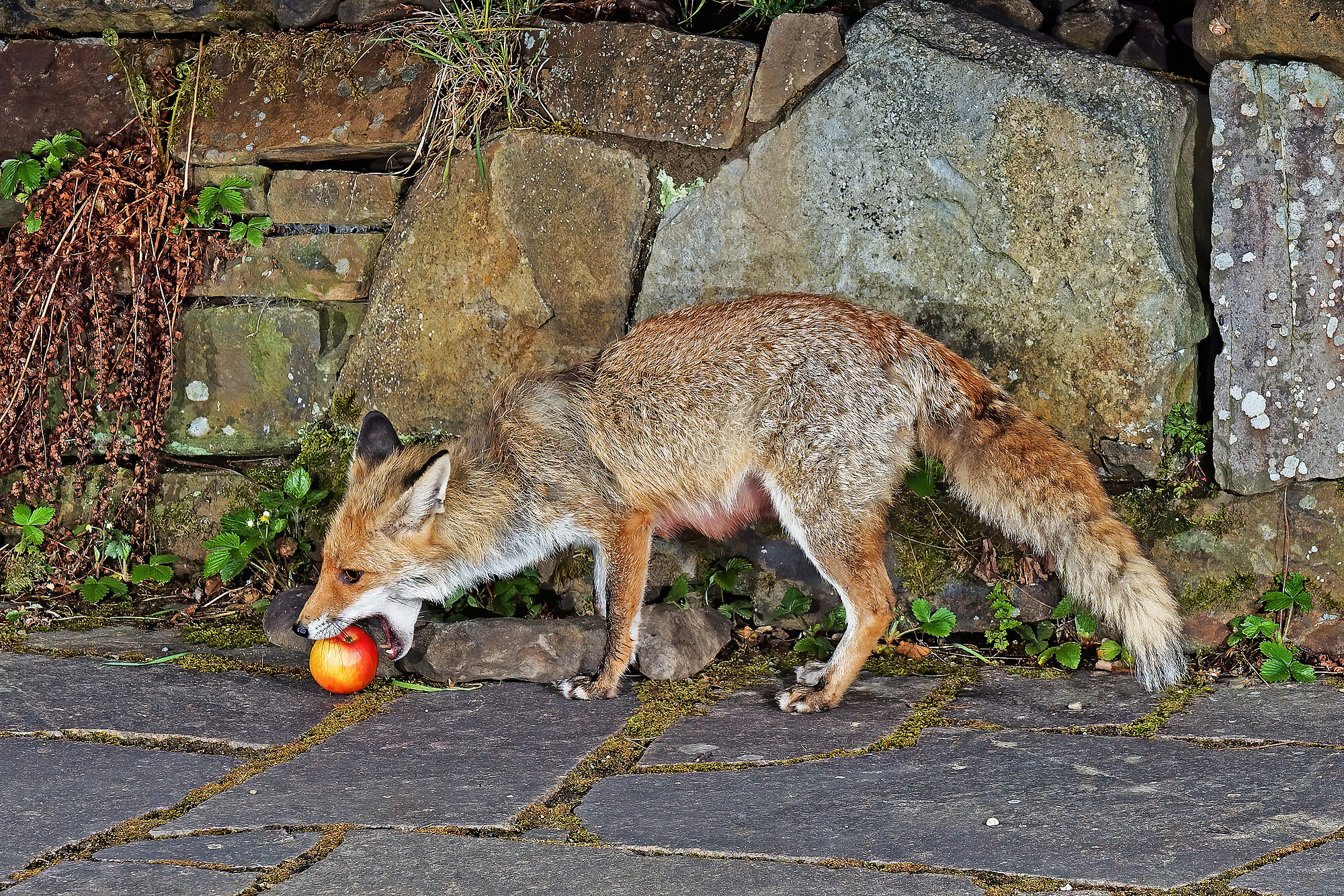 Eigentlich war der Apfel für die Amseln gedacht, aber als "Allesfresser" gibt der Rotfuchs sich auch damit zufrieden. Füchse sind überwiegend dämmerungs- und nachtaktiv, was eine Begegnung selten macht.