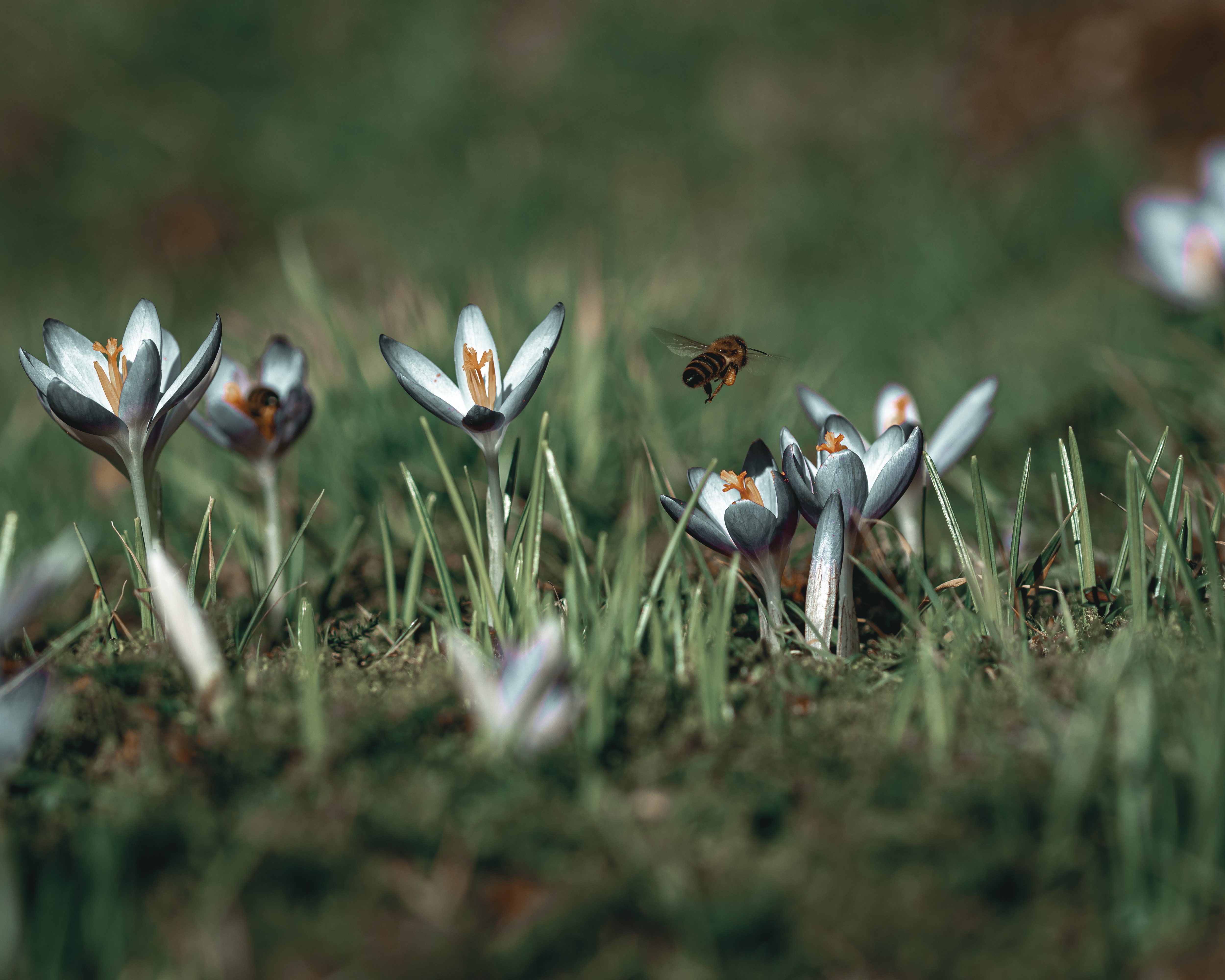 Ein schöner Einblick in das Arbeitsleben einer Biene. Die Körbchen an den Beinen sind schon gut gefüllt mit Pollen. Krokusse gehören zu den ersten wichtigen Nektar- und Pollenpflanzen im Jahr.