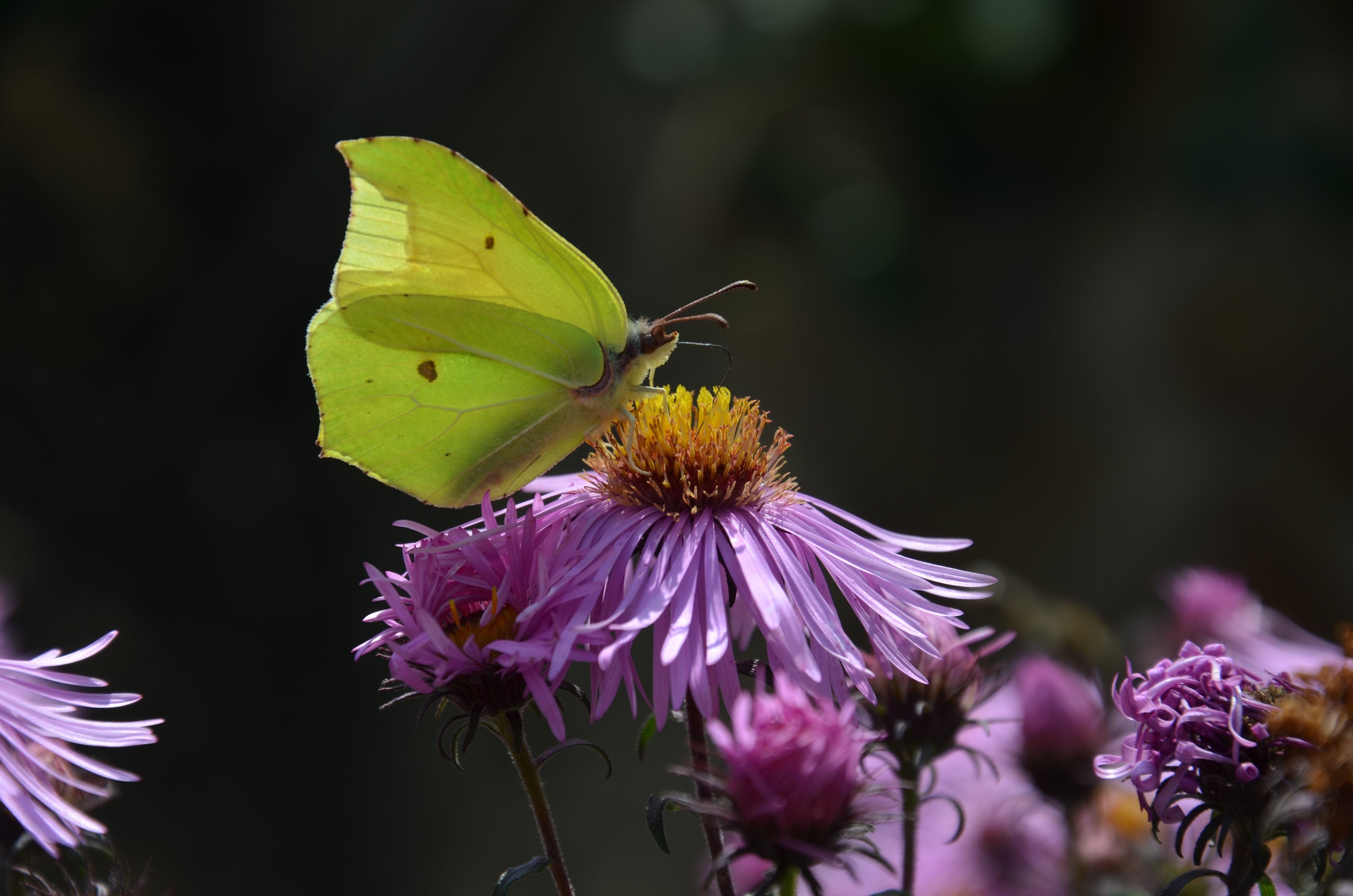 Die Männchen des Zitronenfalters sind deutlich an der gelben Färbung und dem orangenen Fleck zu erkennen. Auf Nektarsuche kommen sie hier im Garten in Irmgarteichen vorbei.