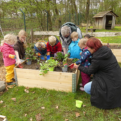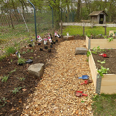 So belegte die Ev. Kita Wahlbach mit einem gebastelten Modell eines Naschweges, mit Beerensträuchern, Stauden und Hochbeeten den 1. Platz. Hier können die Kinder durch einen Weidenbogen in den vielfältigen Naschweg eintauchen und auf Sitzsteinen beobachten und naschen. Umgesetzt wurde die Maßnahme durch den Garten- und Landschaftsbaubetrieb Dietewich aus Burbach-Holzhausen. Zum Abschluss der Baumaßnahme bepflanzte Familie Dietewich gemeinsam mit den Kindern die Hochbeete mit Salat, Kohlräbchen und Kräutern.