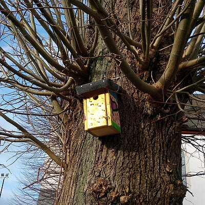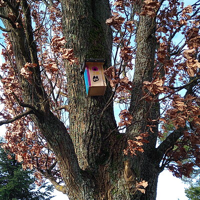Im Rahmen der Natur-AG in der OGS in Burbach und Wahlbach wurden gemeinsam Nistkästen gebaut und bemalt. Da auf dem Schulgelände bereits einige Nistkästen hängen, wurde ein neuer Ort für die kleinen Kunstwerke gesucht. Die Ev. Kirchengemeinde in Burbach hat sich sehr über die Anfrage gefreut und so konnten dort die Nistkästen mit dem Küster Axel Sahm aufgehängt werden.